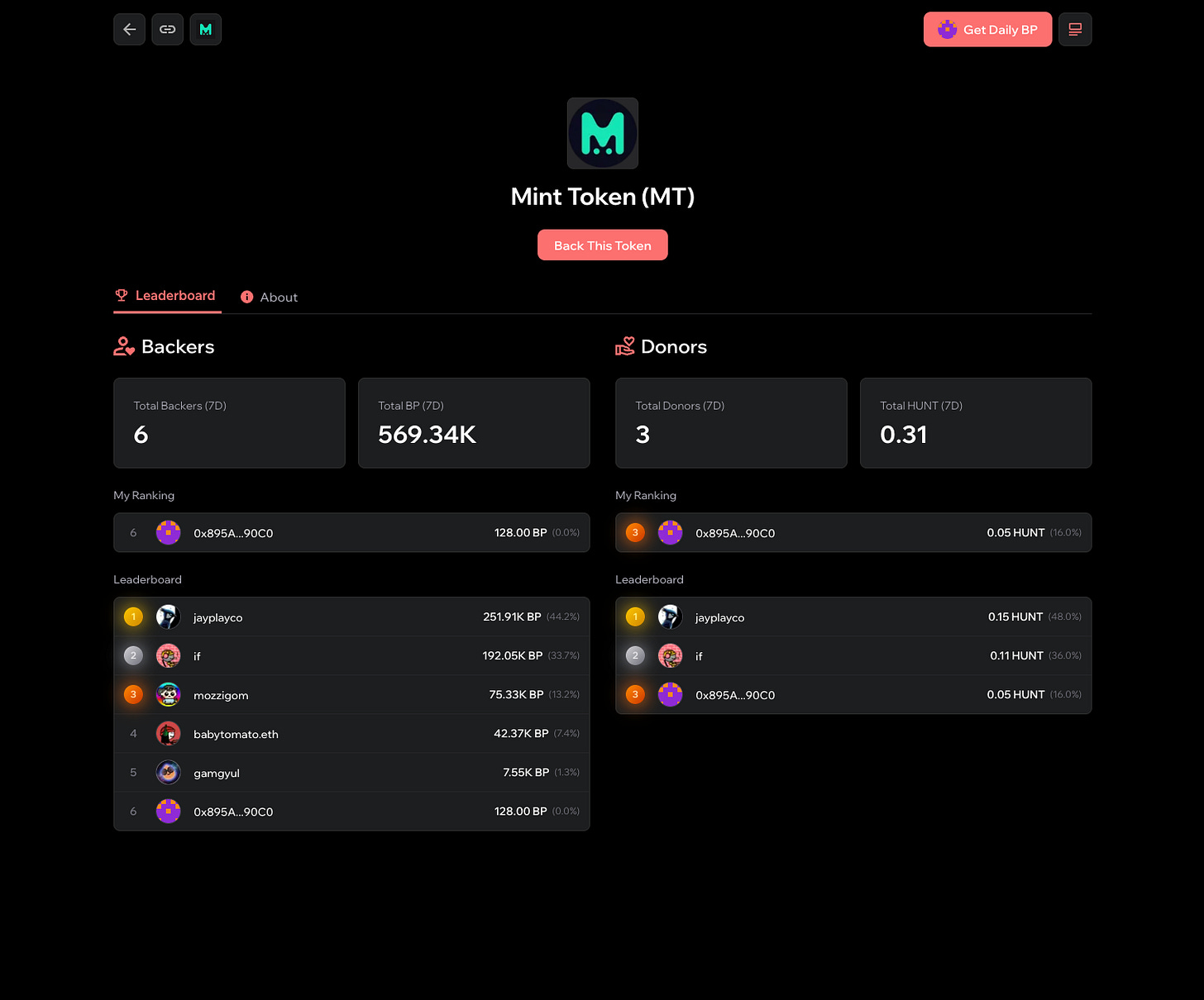 Leaderboard: Shows backers and donors so you can see who is actively supporting this project.