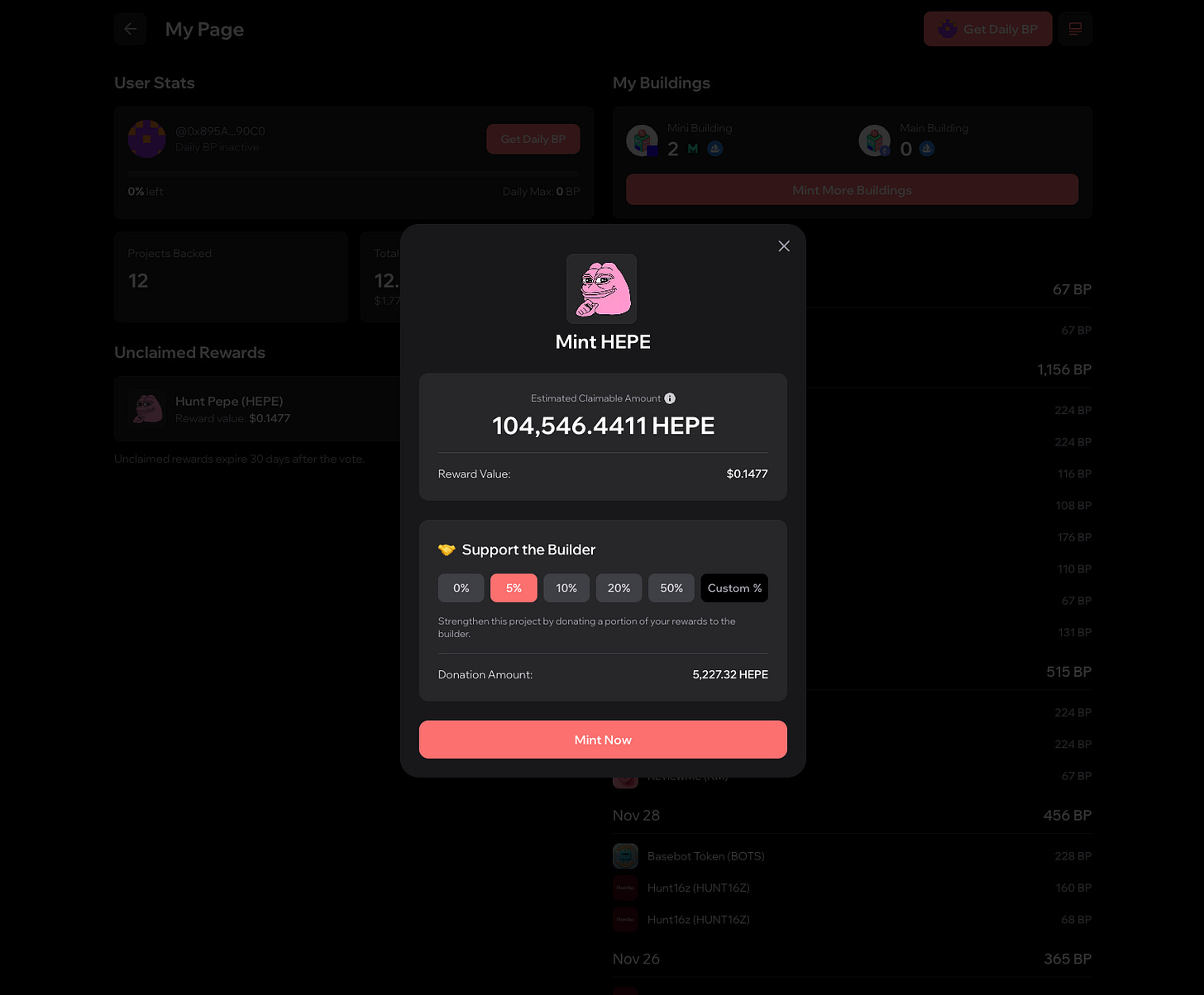 The “Support the Builder” section allows you to donate a portion of your rewards to strengthen the project creators.